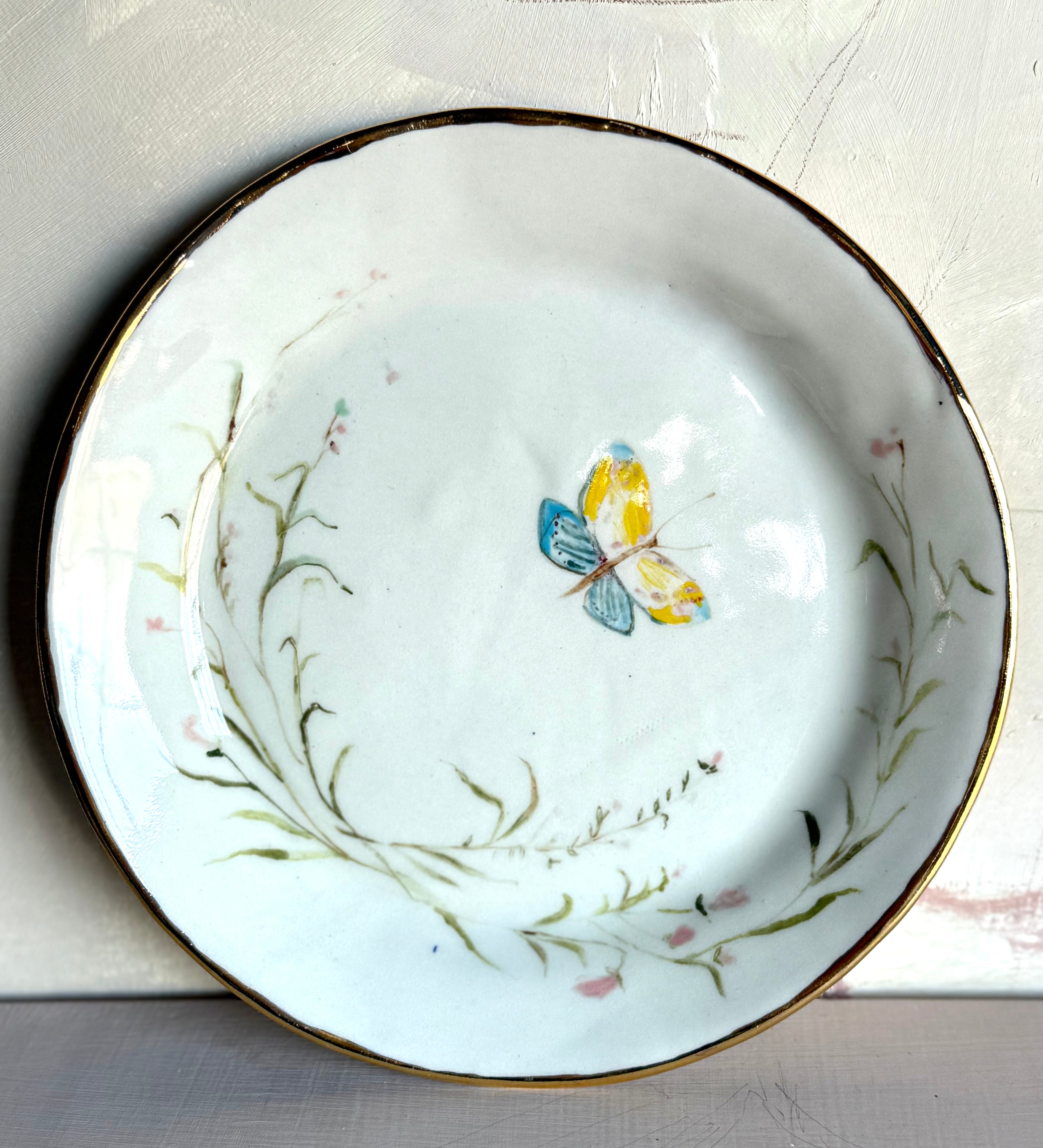 Hand-Pinched English Porcelain Dessert Plate with Painted Butterfly & Botanicals
