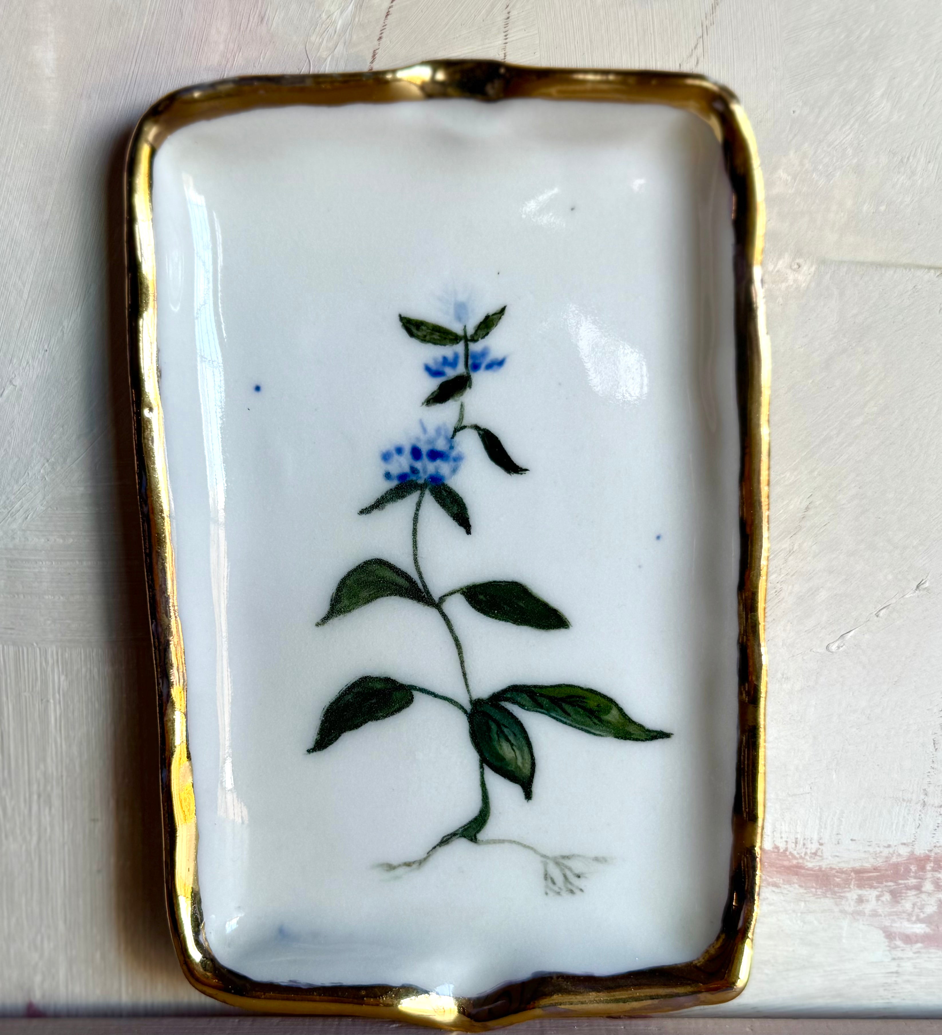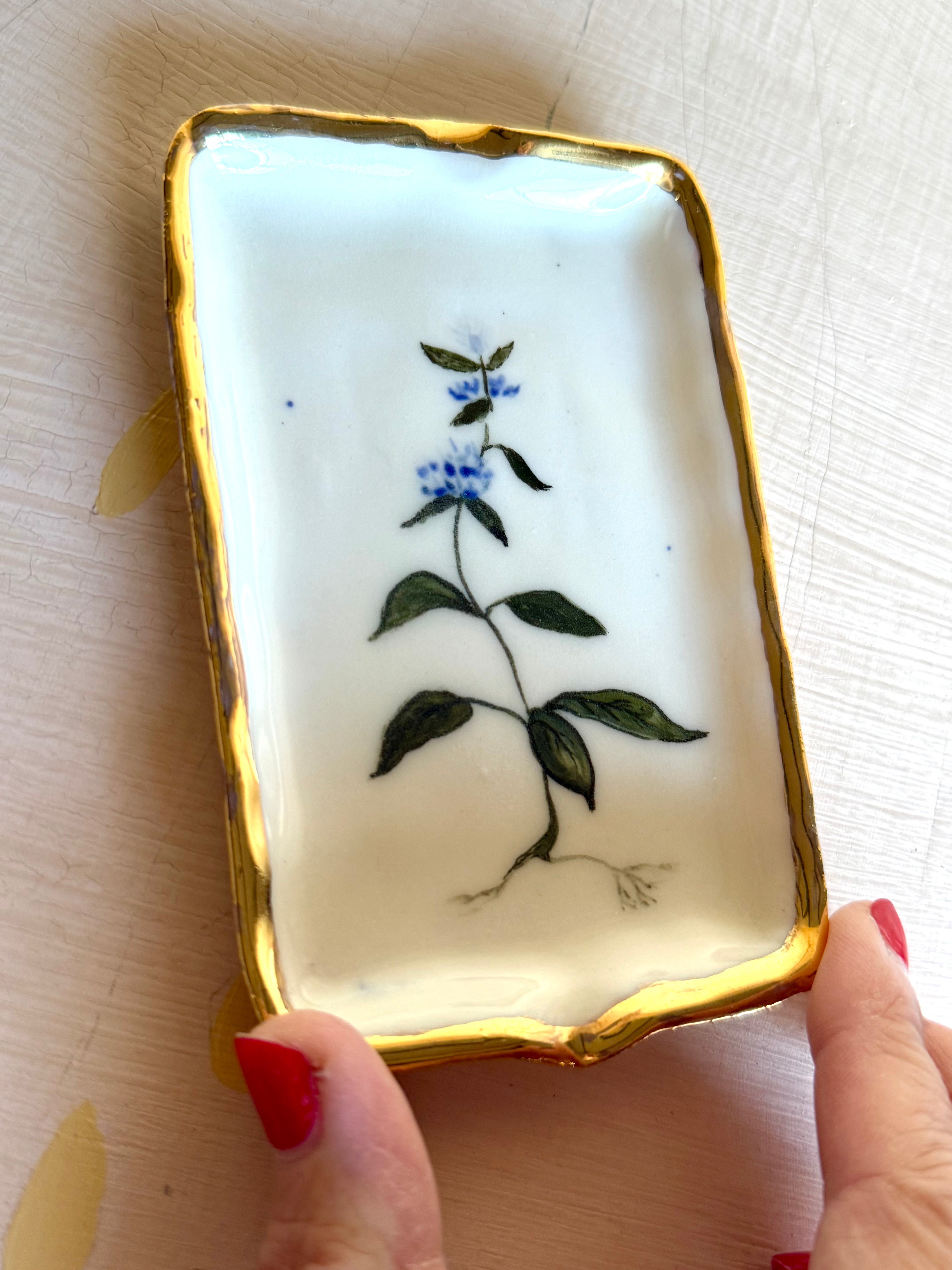 The art is approached in a painterly manner. Careful mark-making balances the playful intention behind each work of art. The base is hand-signed, the piece is glazed, and then fired in a glaze firing for another 24 hours at 2300 degrees F. A third firing occurs after the application of the 22k gold bijoux detail. The period of time from start to finish for one dish is about one month in the making.