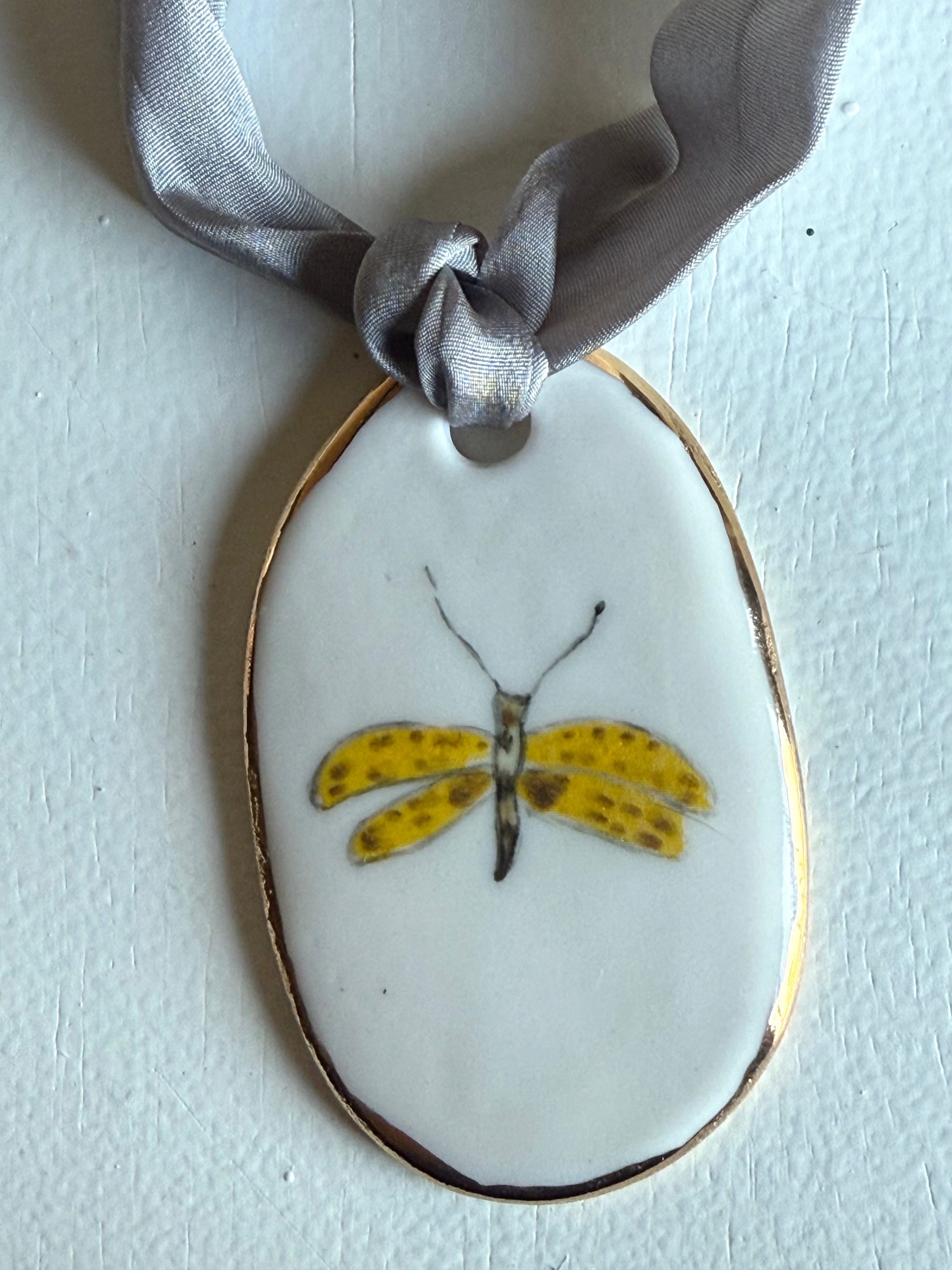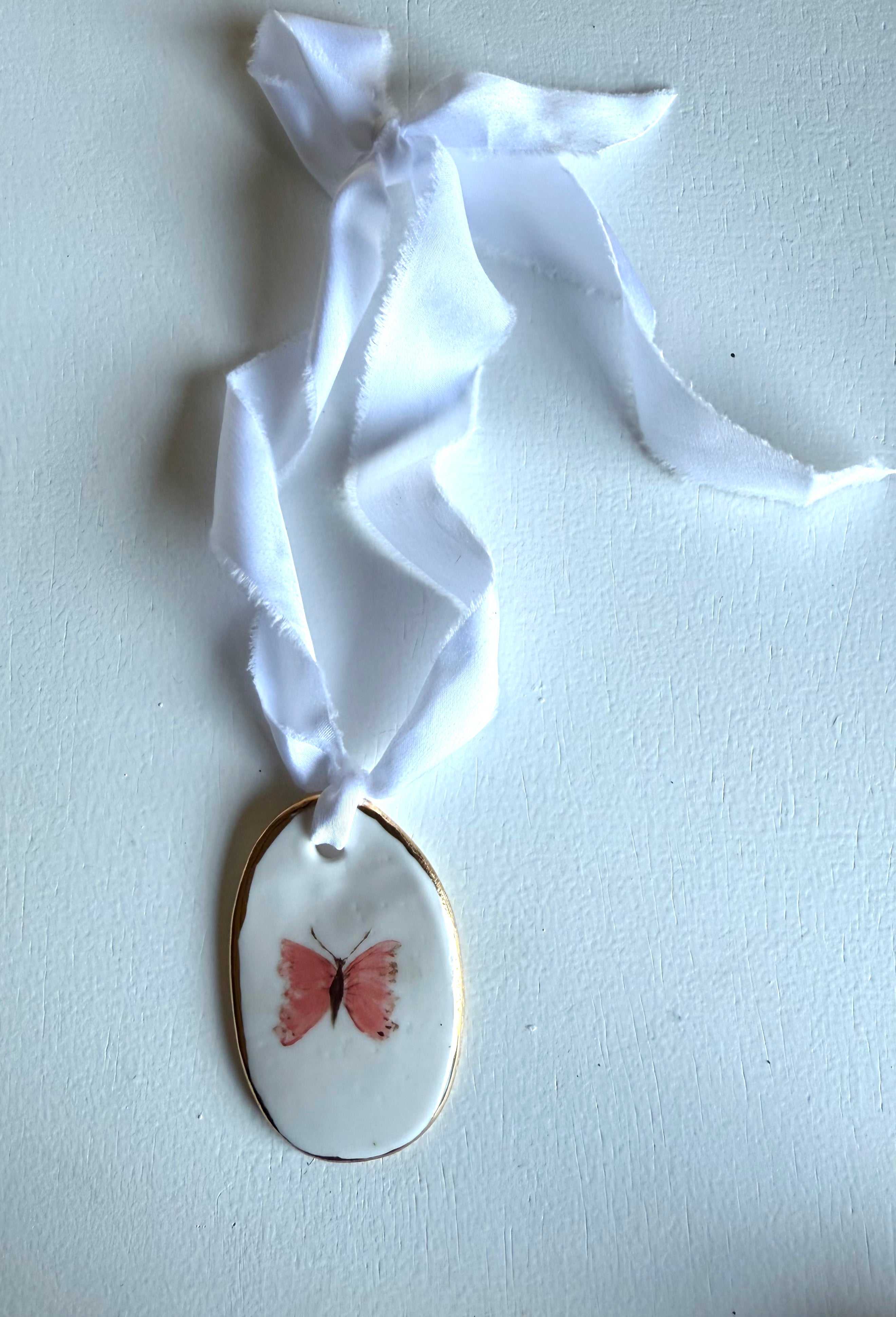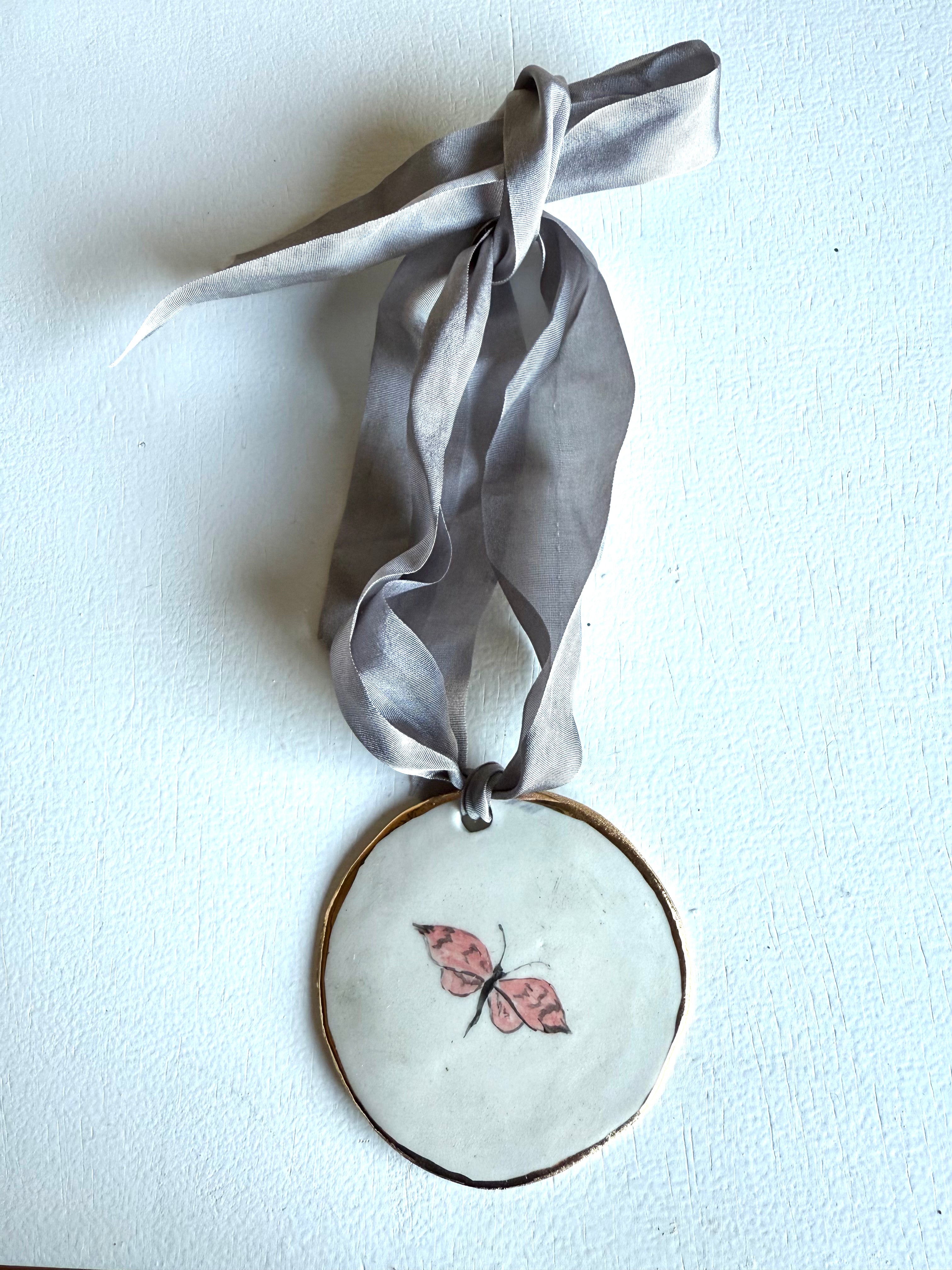 This Cabine ornament is hand-painted and finished with an adjustable silk ribbon for hanging. Once the clay is cut and shaped, the piece is slowly dried to prevent warping, then sponged to refine the form. When dry, each piece spends 24 hours in the kiln for a bisque firing at 1800°F. After cooling and removal from the bisque fire, the pieces are gently hand-sanded and sponge-bathed.