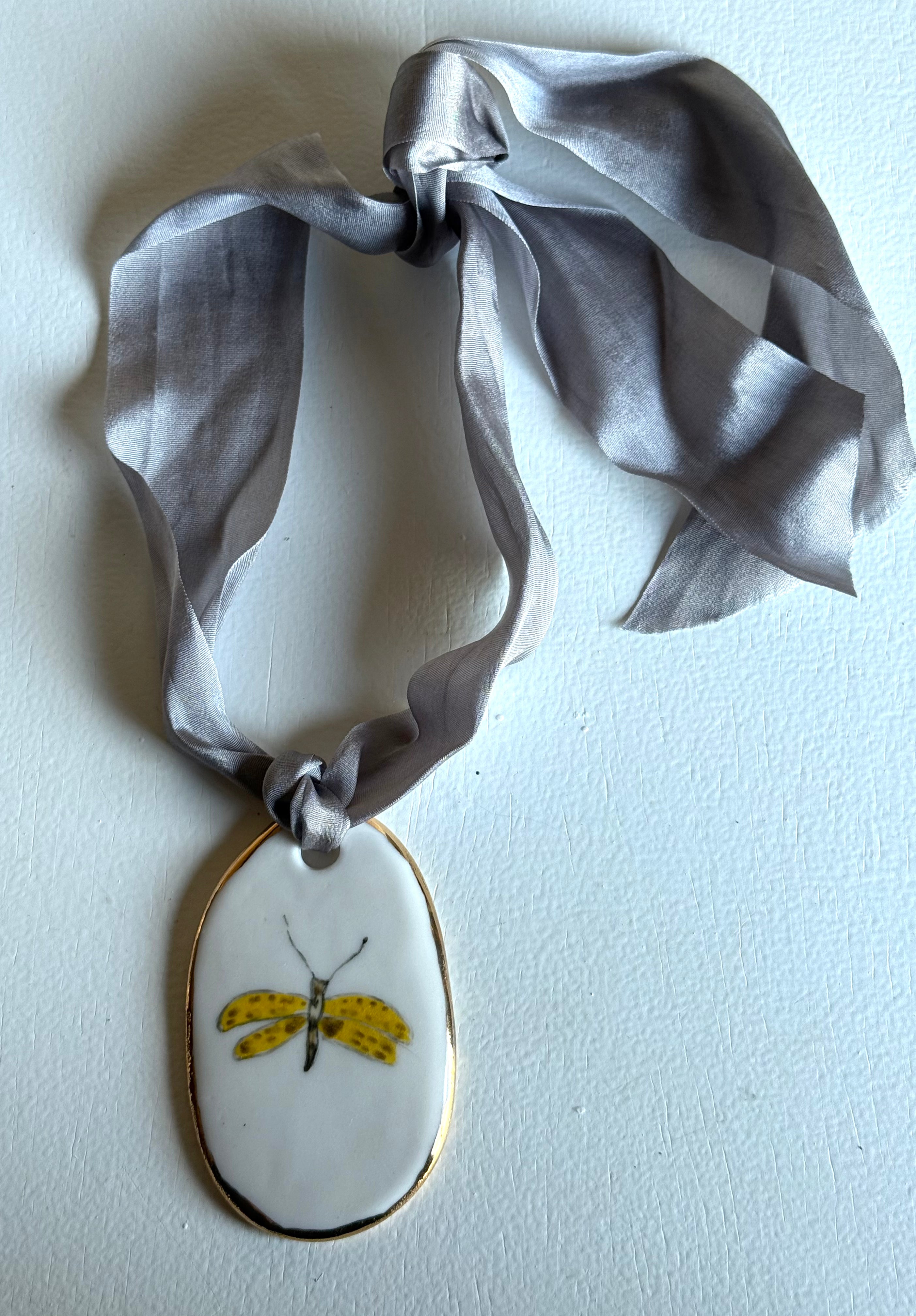 The art is approached in a painterly manner. Careful mark-making balances the playful intention behind each work of art. The base is hand-stamped. The piece is glazed and then fired in a glaze firing for another 24 hours at 2300°F. A third firing occurs after the application of the 22k gold bijoux detail.