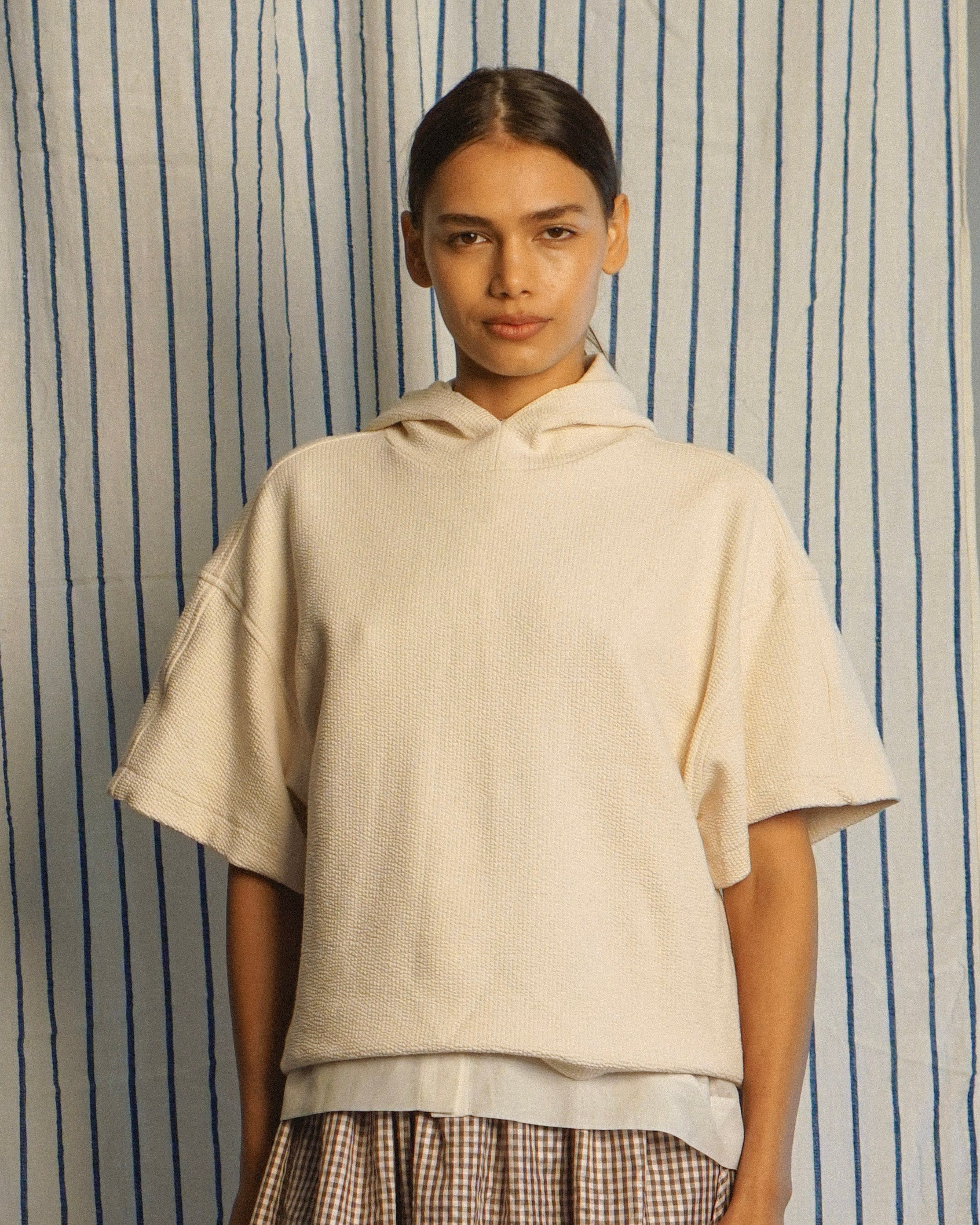 A short-sleeve hoodie with an edgy, sporty vibe that pairs effortlessly with everything in your wardrobe. Crafted from lightweight textured jersey in a clean ivory.