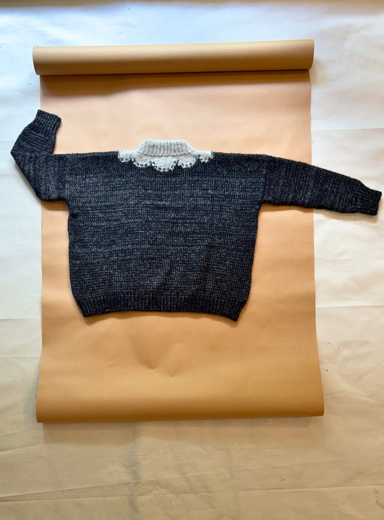 Delicate hand-stitched details trace the scalloped intarsia neckline, a playful yet refined touch that frames the face like petals.