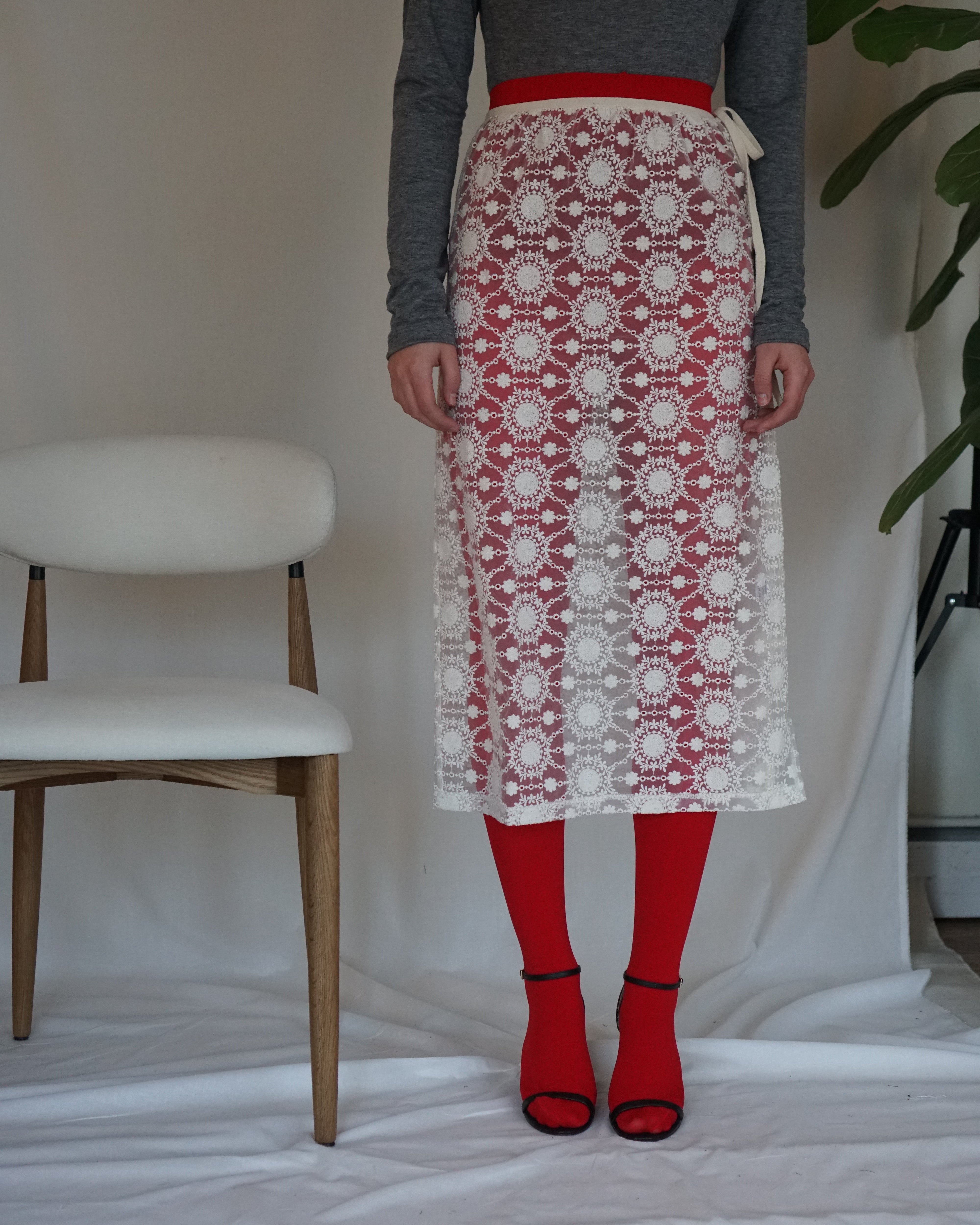 skirt showcases your silhouette through a veil of embroidered organza.  Wear over tights, boy shorts, a slip... get creative! Slip it on and tie at the sides, for a look that’s reminiscent of an apron, but elevated. Runs a bit small, size up.
