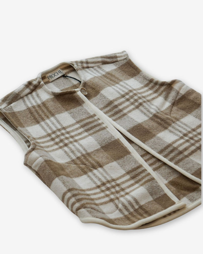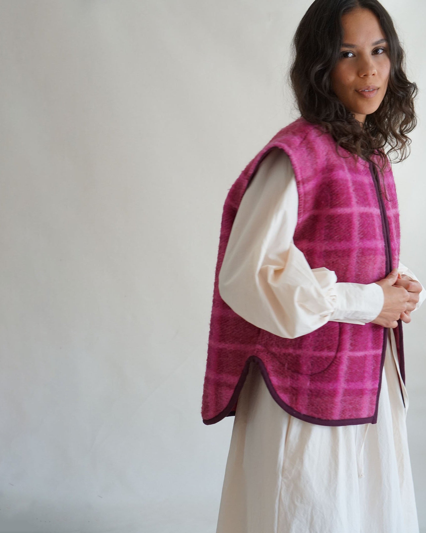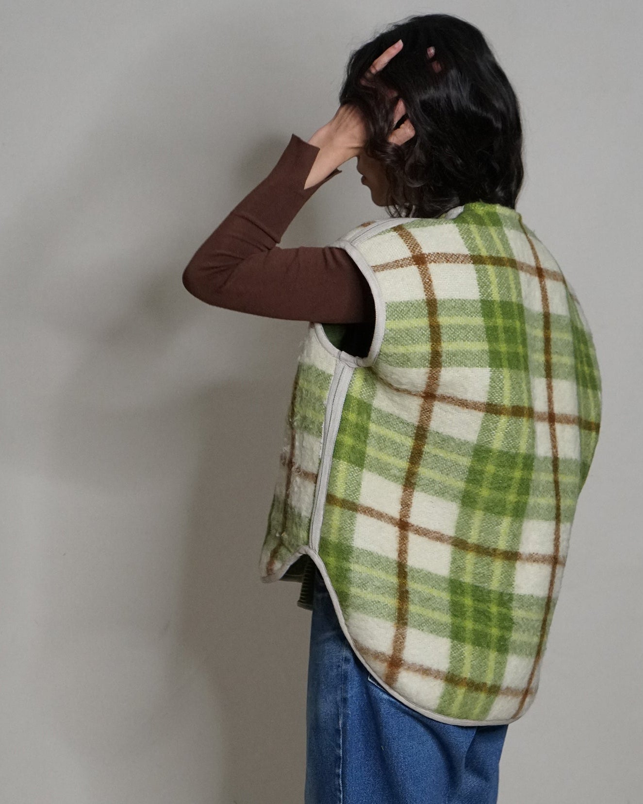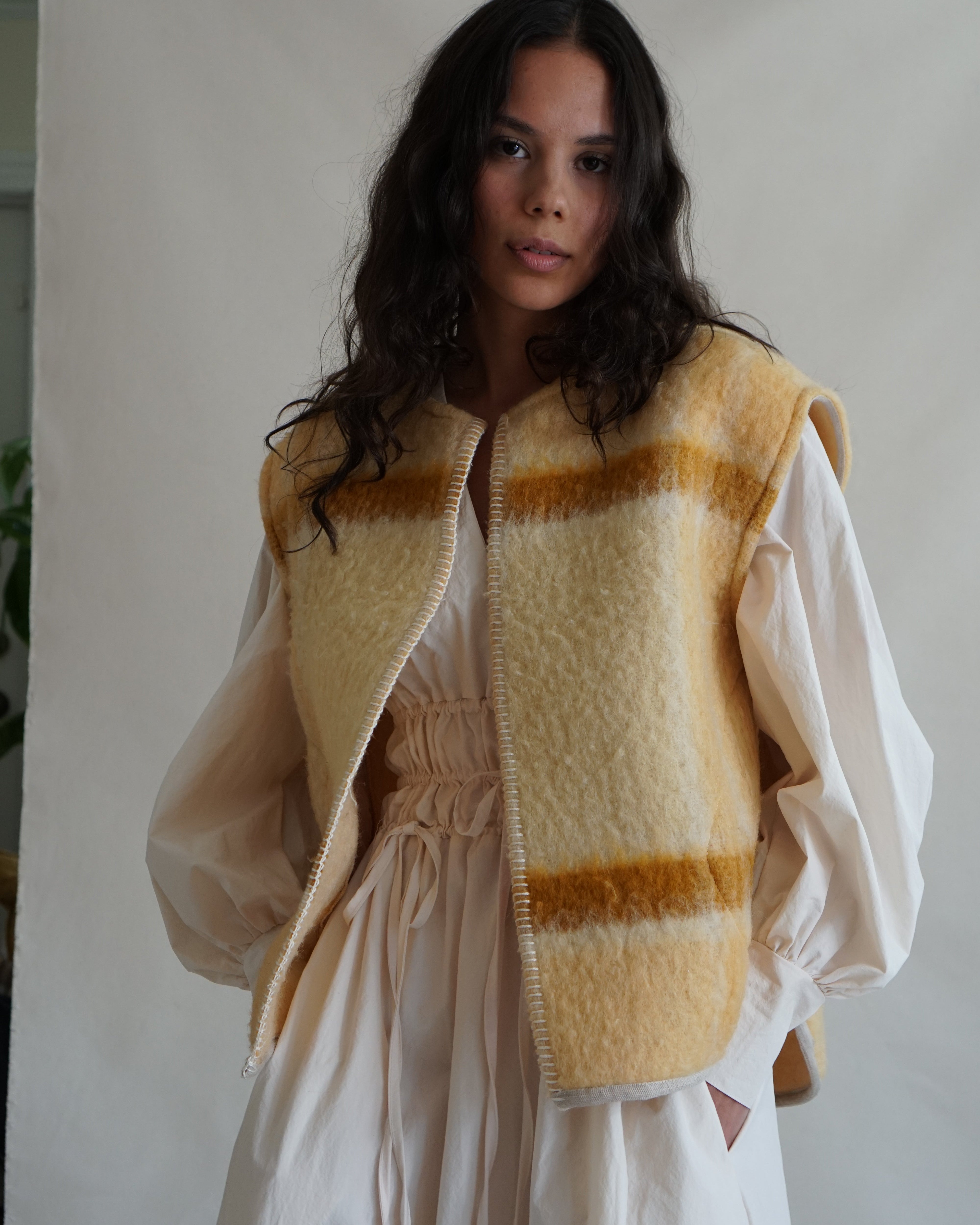 Upcycled from a soft wool vintage blanket, this vest turns comfort into statement. The boxy silhouette feels effortless , structured enough to hold shape, soft enough to live in. Perfect for layering under a coat, over a trench or sweater- there are so many styling opportunities with the versatile piece in fresh Fall neutrals that go with everything you already own.