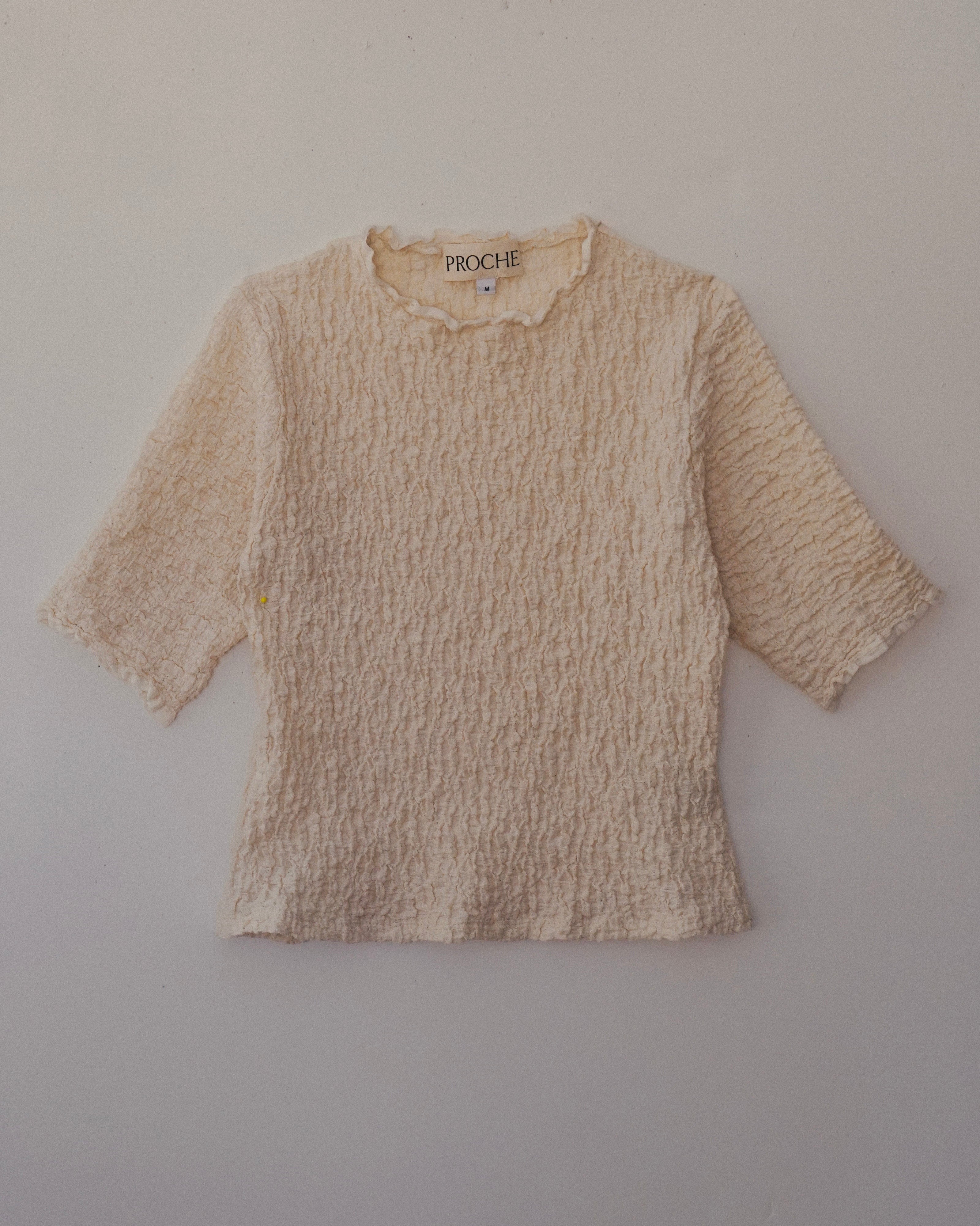 A shrunken staple reimagined in a bubble-textured stretch fabric that makes every outfit more fun. This unexpected fabric, paired with a classic silhouette, transforms your go-to white tee into an elevated essential. Wear layered or on its own, this is the stand-out versatile piece you will grab for over and over,