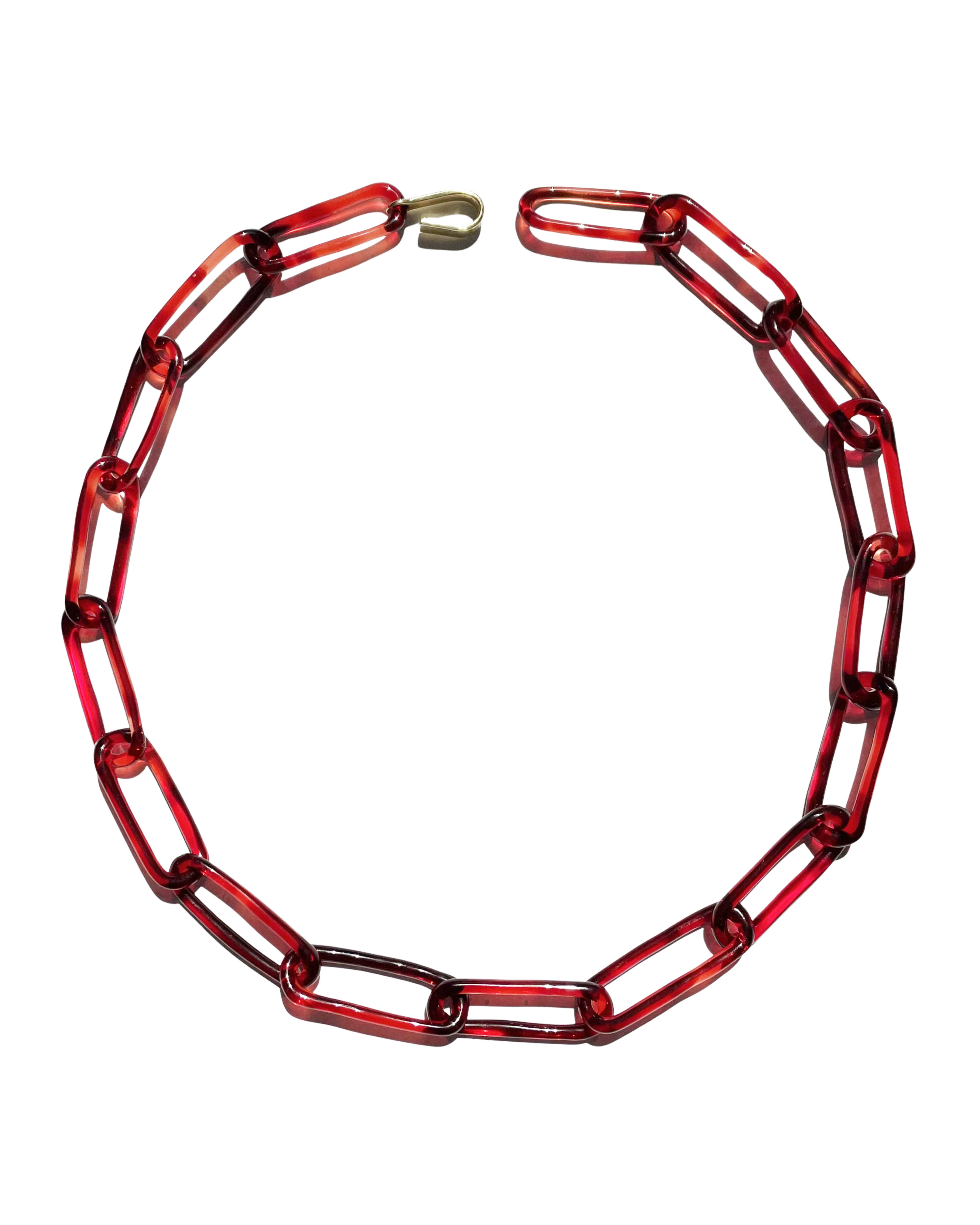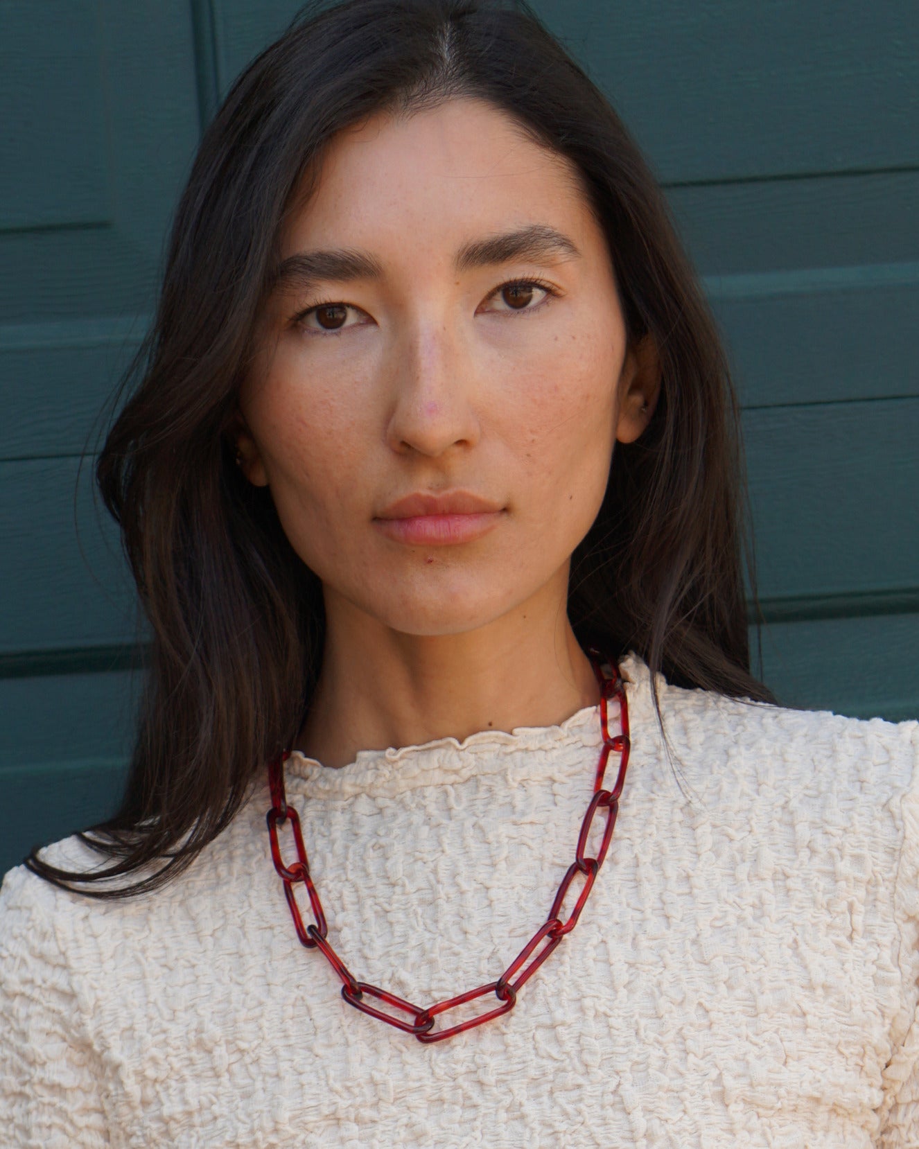 Deep red glass small oval glass necklace with a small brass clasp. Jane D’Arensbourg launched her glass jewelry designs in 2002 in NYC. Jane’s process starts with raw, durable, borosilicate glass that she transformed with a torch free form. Using heat and gravity to shape the glass, the artist handcrafts one-of-a-kind sculptural jewelry. Jane D'Arensbourg has exhibited in museums and galleries internationally. Her work can be found from New York to Japan.