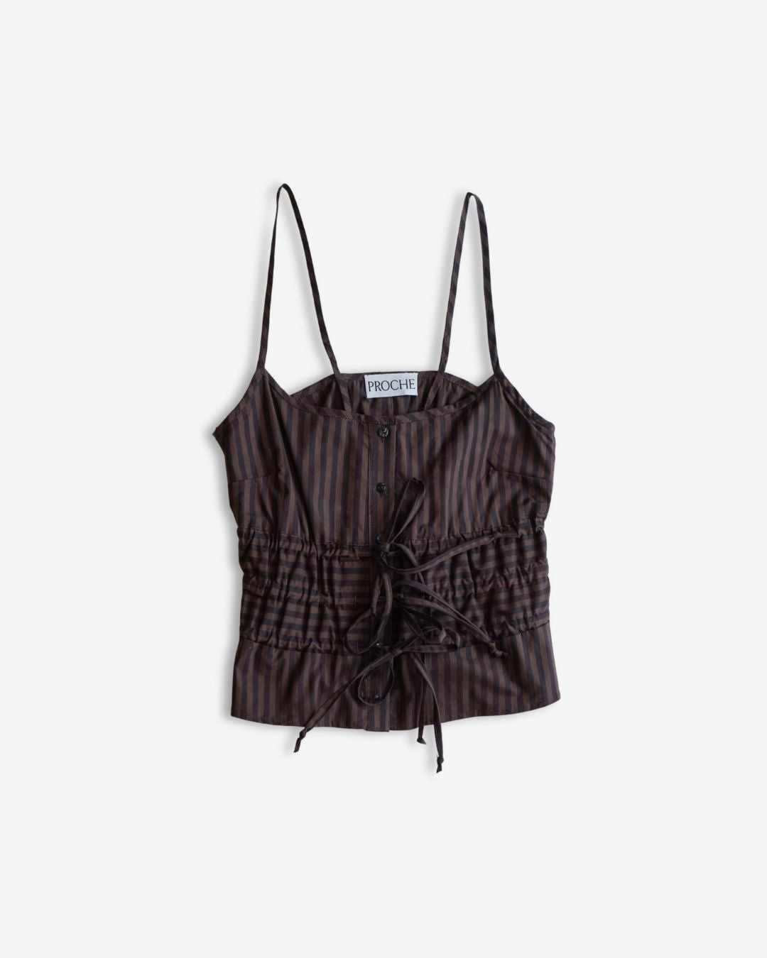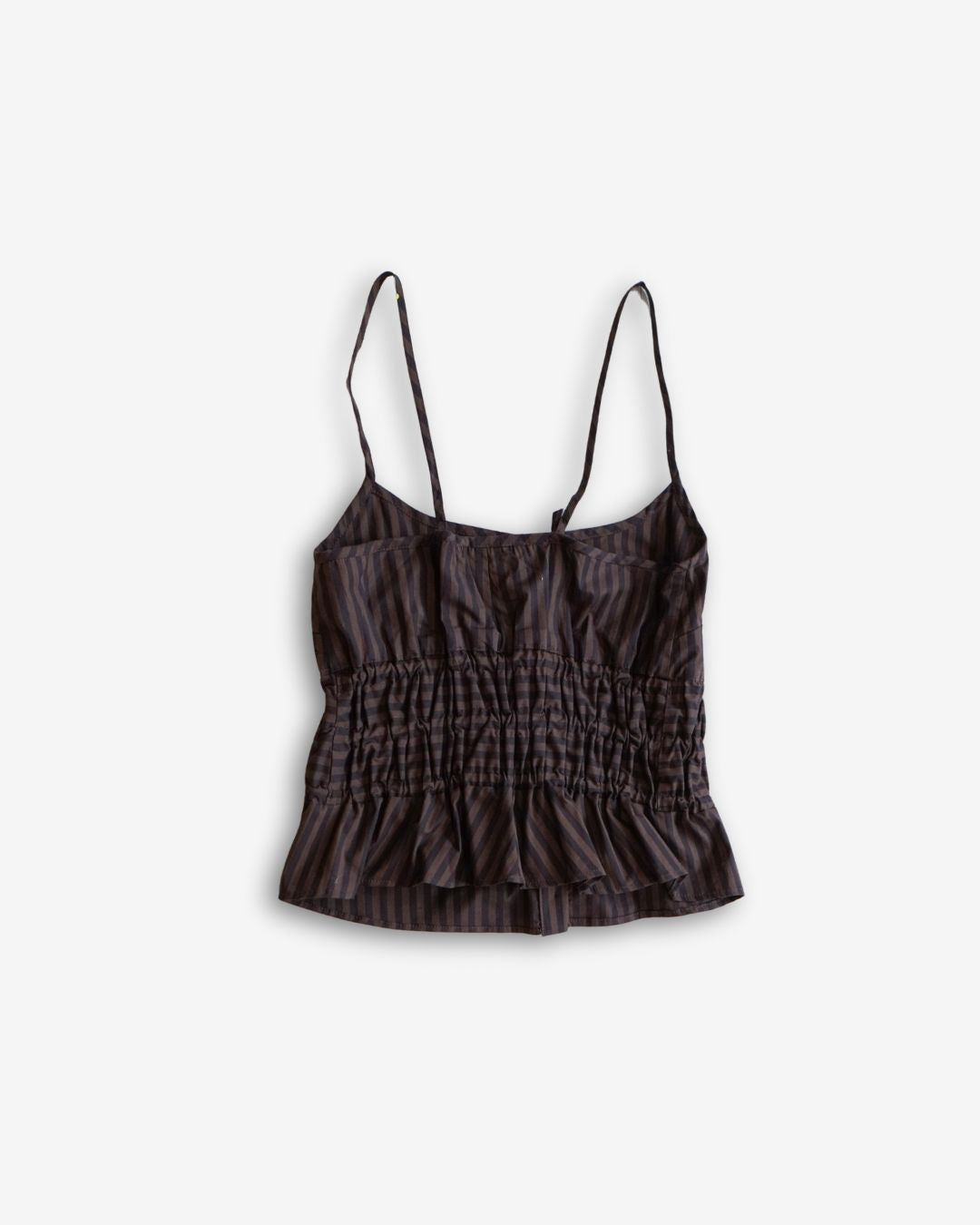 Brown stripe Cami is and original sample blouse, crafted from cotton poplin with a subtle stretch. This romantic top features two adjustable drawstrings for customizable shaping, delicate spaghetti straps, and a button-front detail. Cinching at the waist creates a soft peplum silhouette that’s both flattering and feminine.