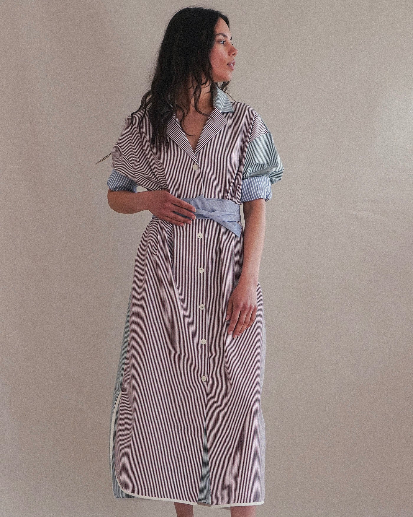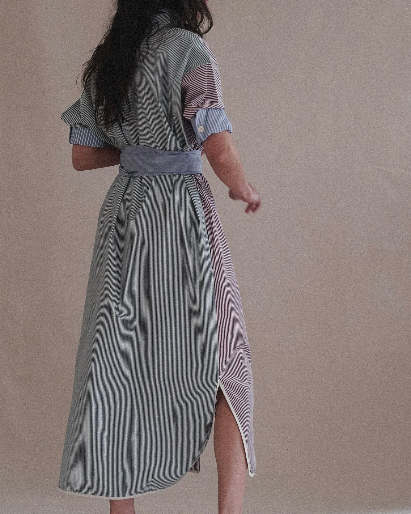 Made from a variety of deadstock men’s shirting artfully blocked together in our oversized shirt dress. Shapeless, drop shoulder and rolled sleeve give an effortless look. Signature hemline and binding details.
