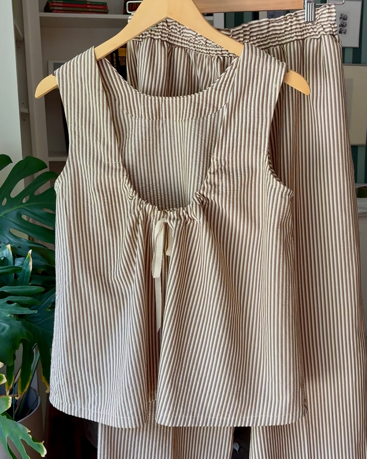Cotton blend sun washed stripe Uma blouse is as versatile as it is beautiful. Fully reversible, wear lower neckline in front or back. Drawstring adjustability.  Wear with our Coordinating Sunday Pant or Upcycled denim.
