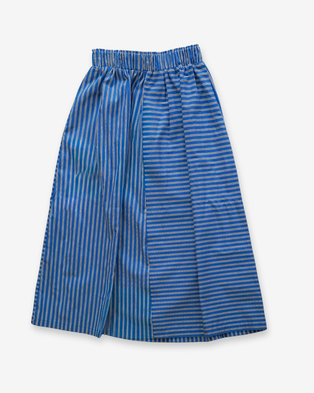Our famed Sunday pant, now in a skirt. Elastic waistband, in seam pockets and intersectional stripes create a go-to skirt that can be dressed
