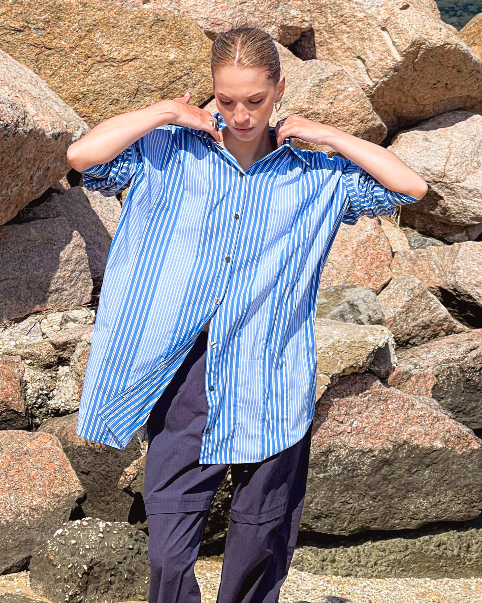 The “slash and spread” shirtdress in Blue Stripe Sample