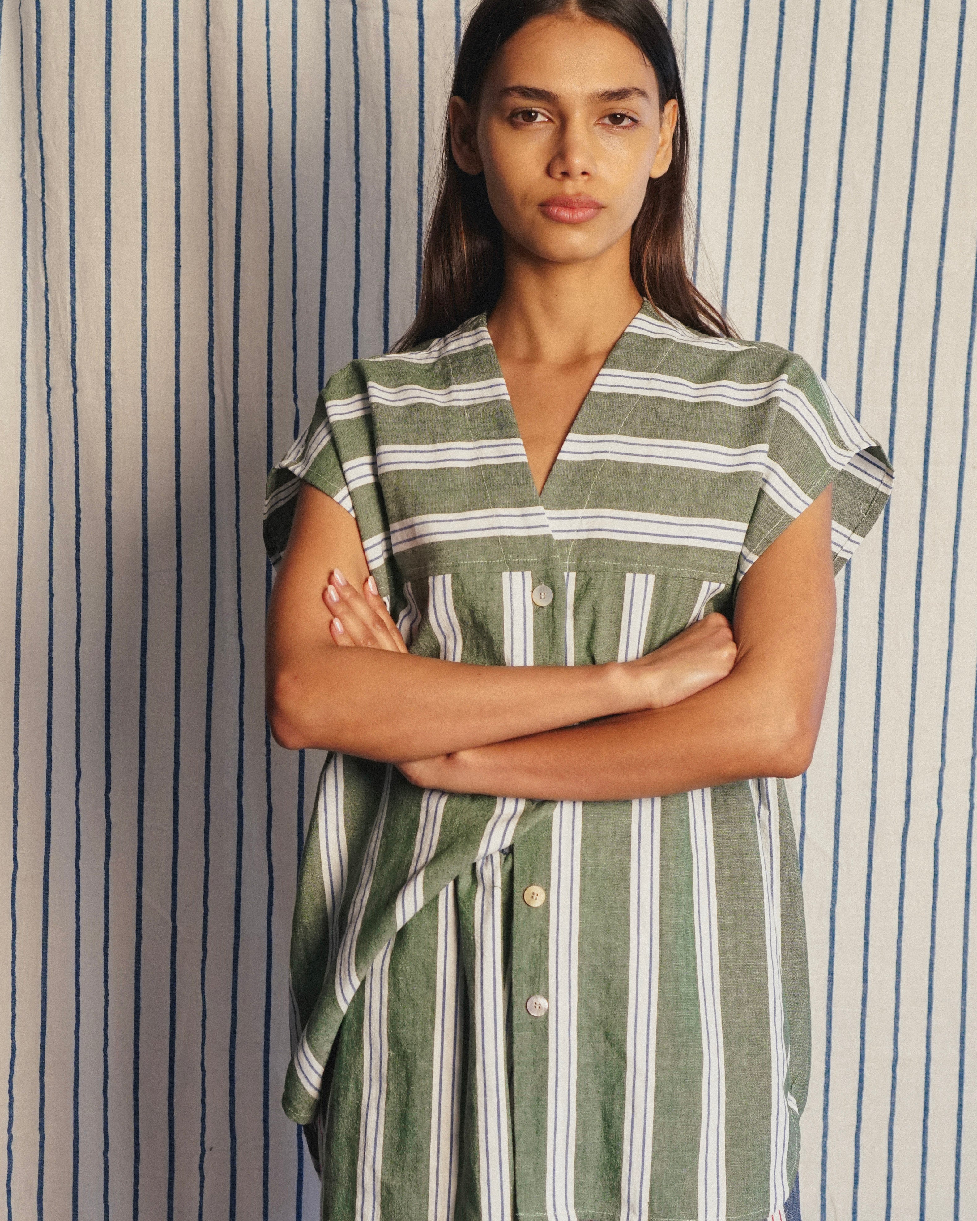 buttons at the neckline for a collared look, or at the waist for
