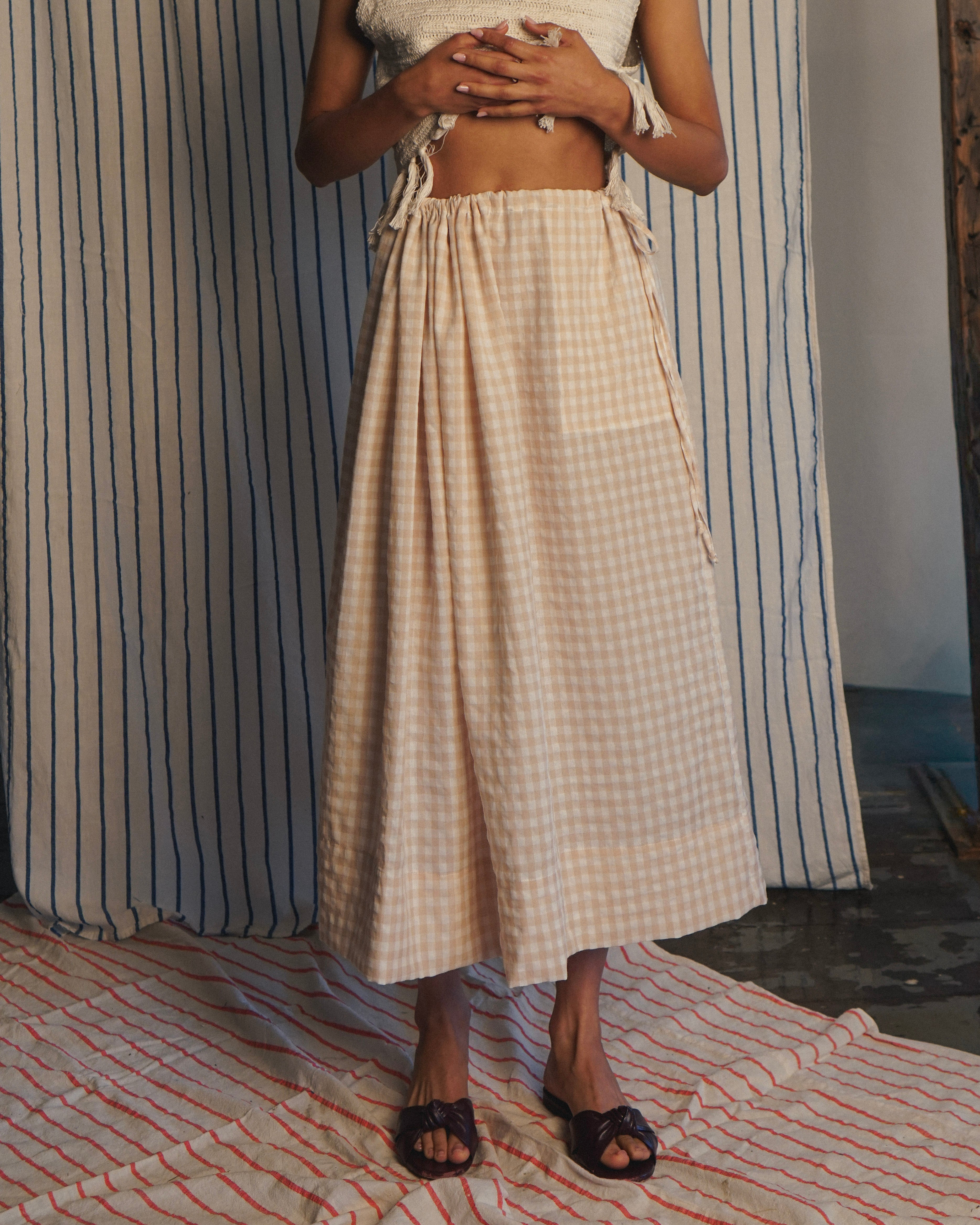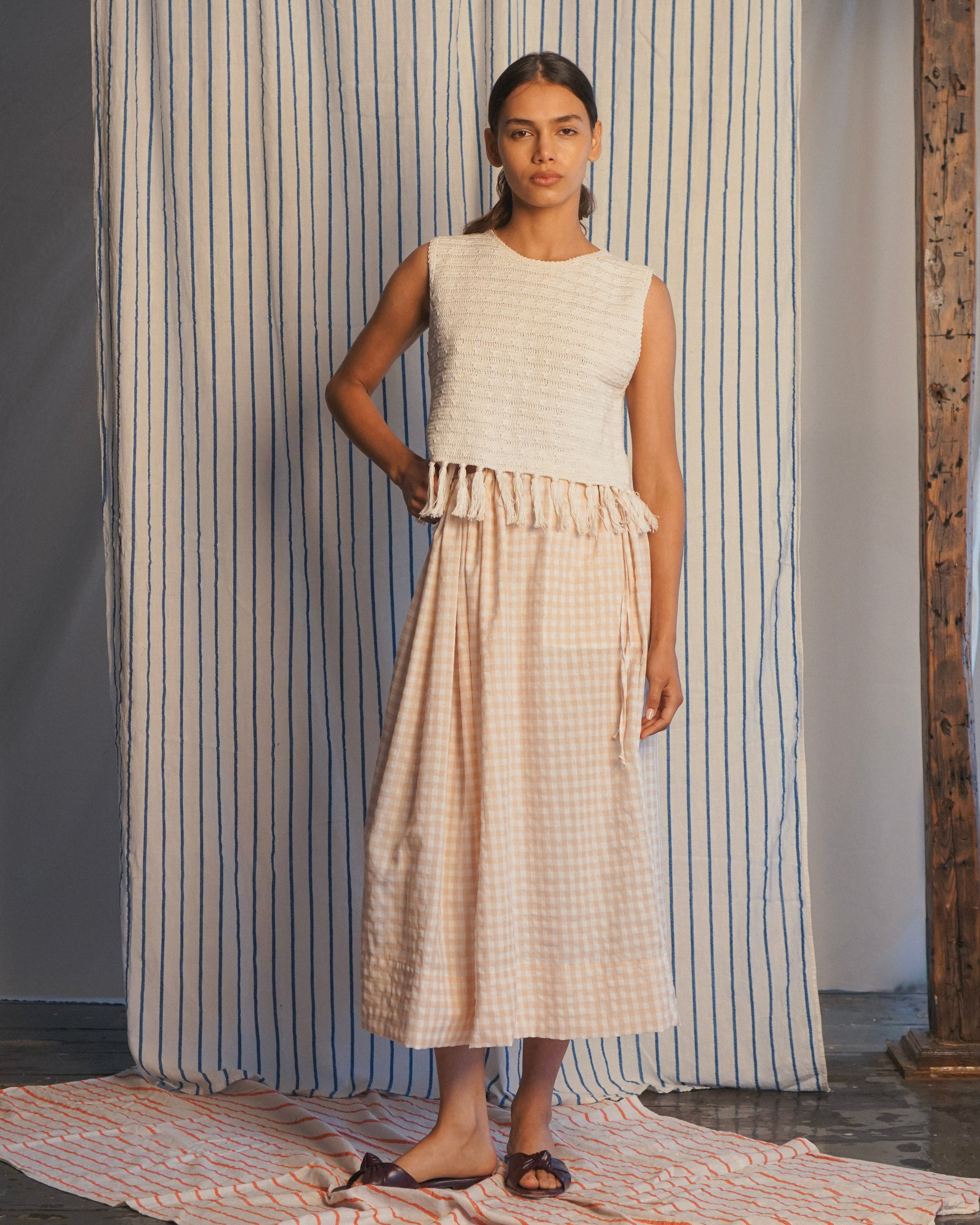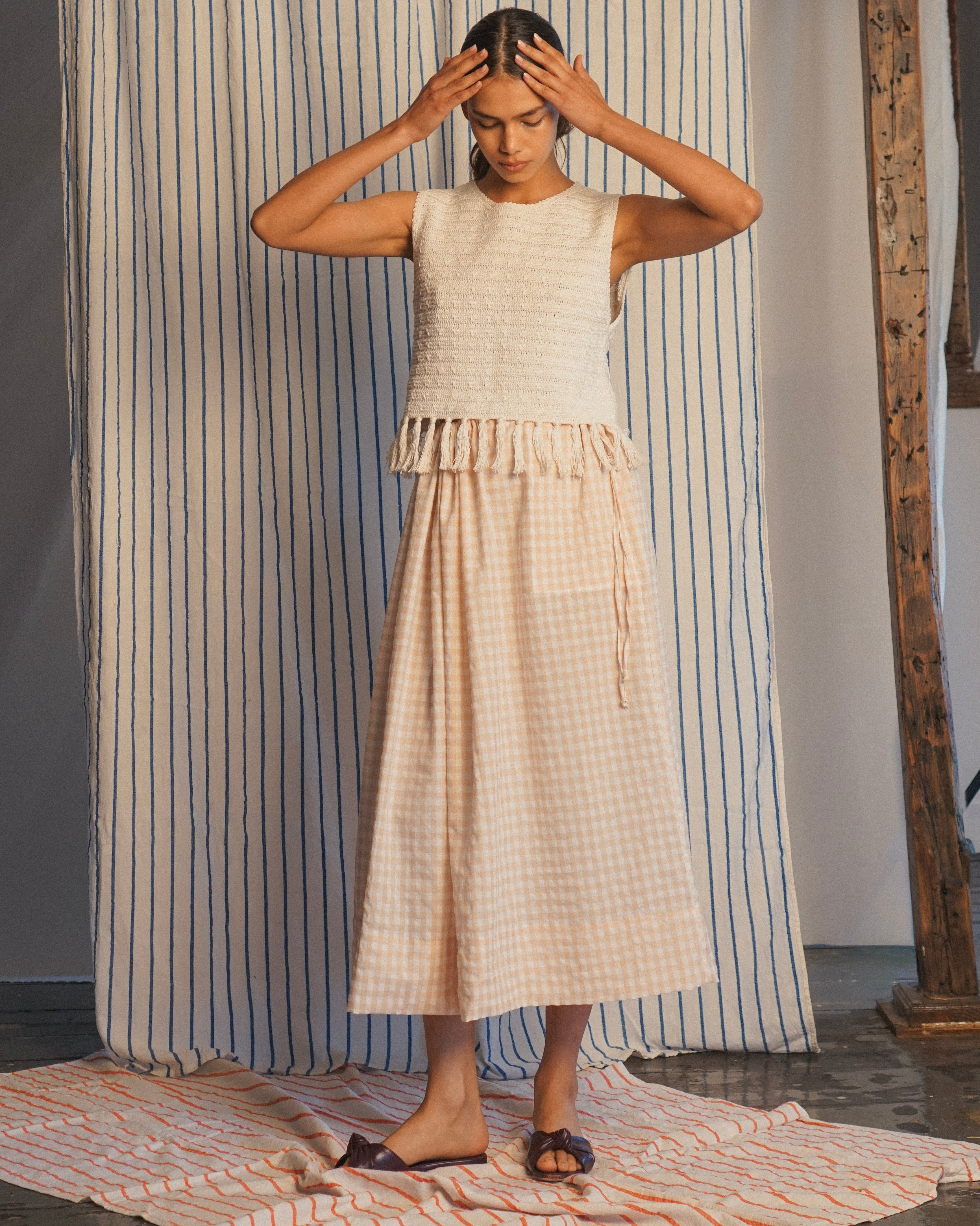 for a timeless look. Side pockets and wide hem. Offered in Butter yellow, and Oat Gingham