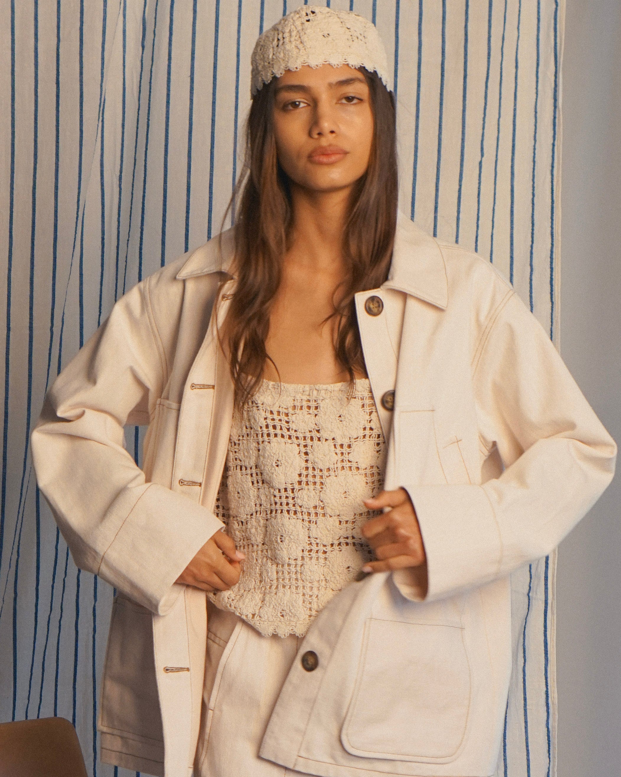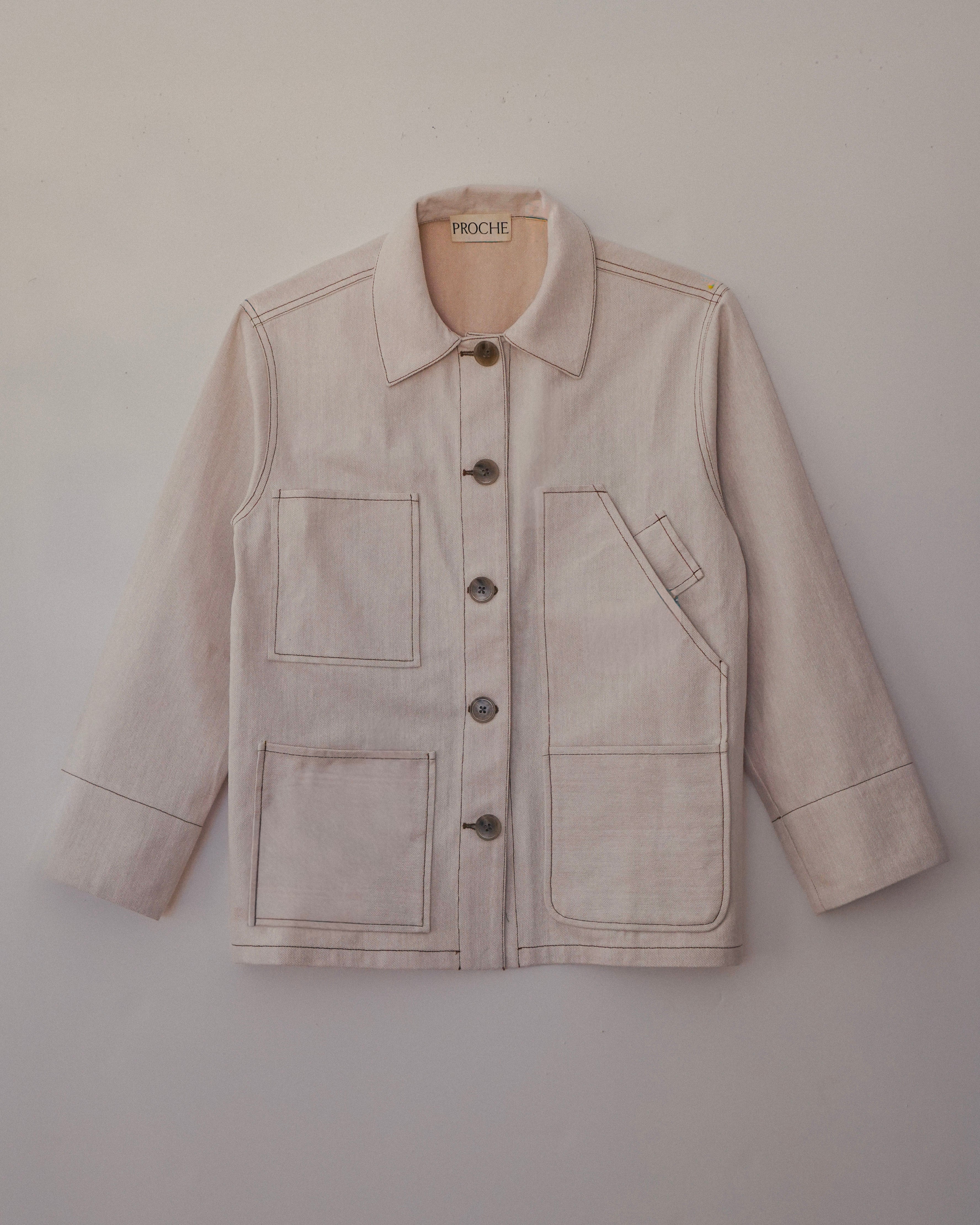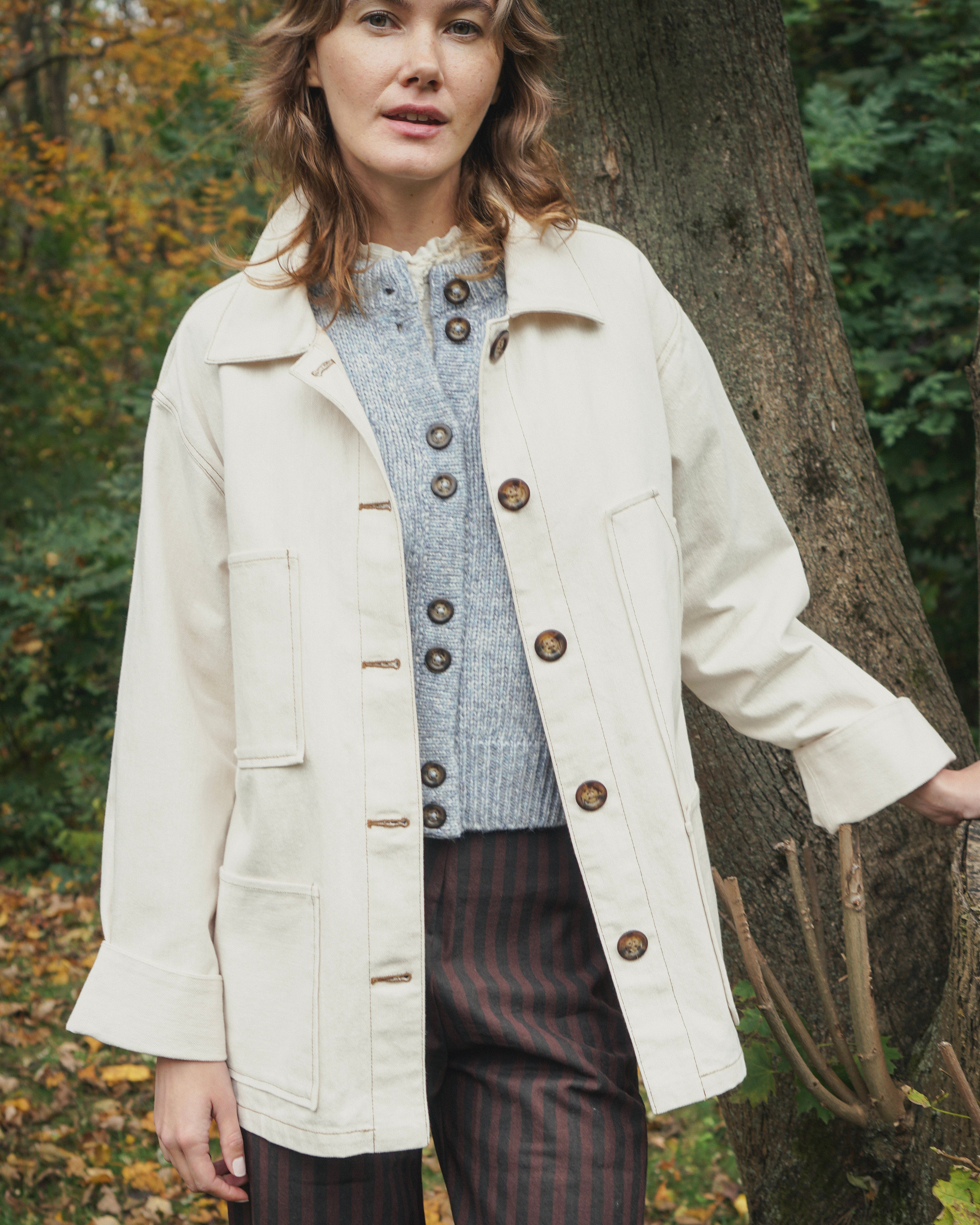 A timeless barn jacket in soft ivory denim with classic brown contrast stitching. Designed with 5 pockets, an oversized silhouette, and finished with vintage horn buttons—this is your classic denim jacket, modernized and stylized for everyday wear.