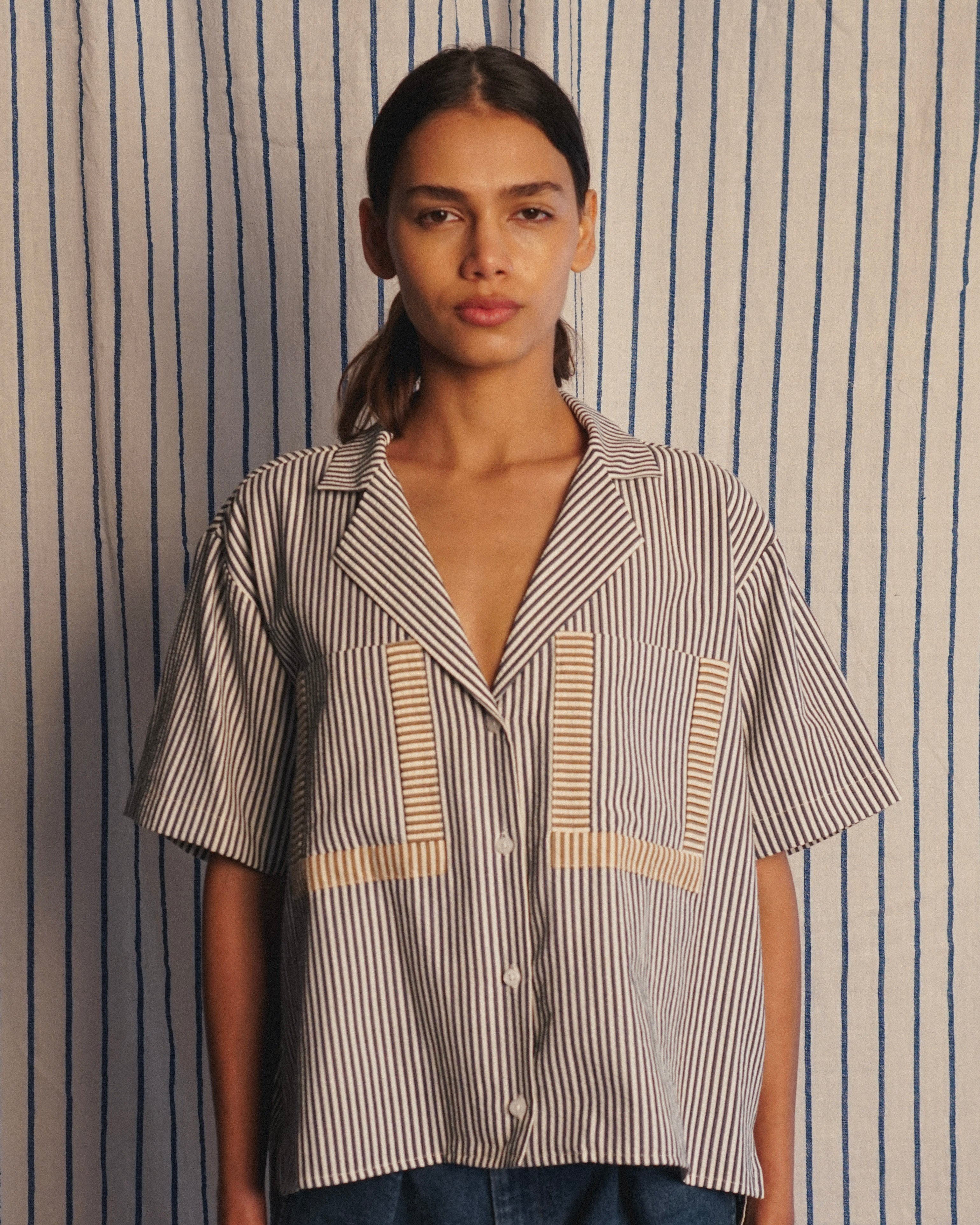 A simple yet super cool shirt that goes with everything. Stripe-textured camp shirt with a contrast-outlined pocket,