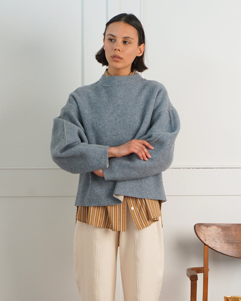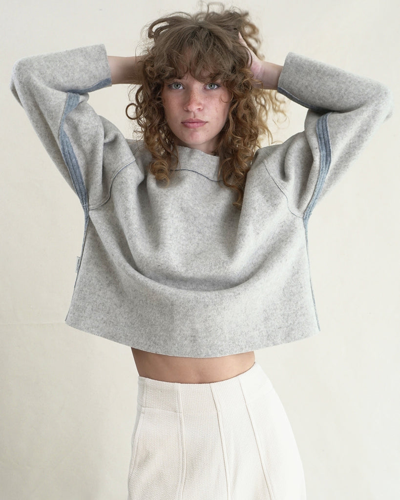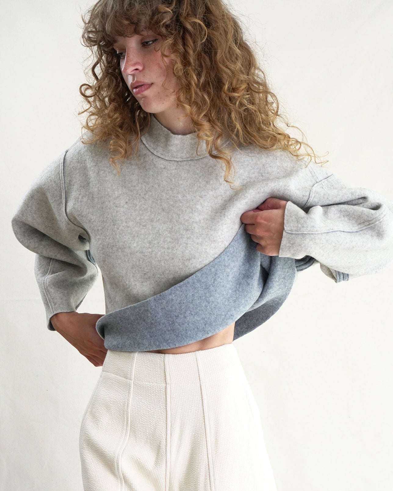 The feeling of the softest sweater ever, with the structure that only felted wool can give. Double faced and fully reversible, cleverly constructed with raw seams and double top stitching. Cropped and boxy with