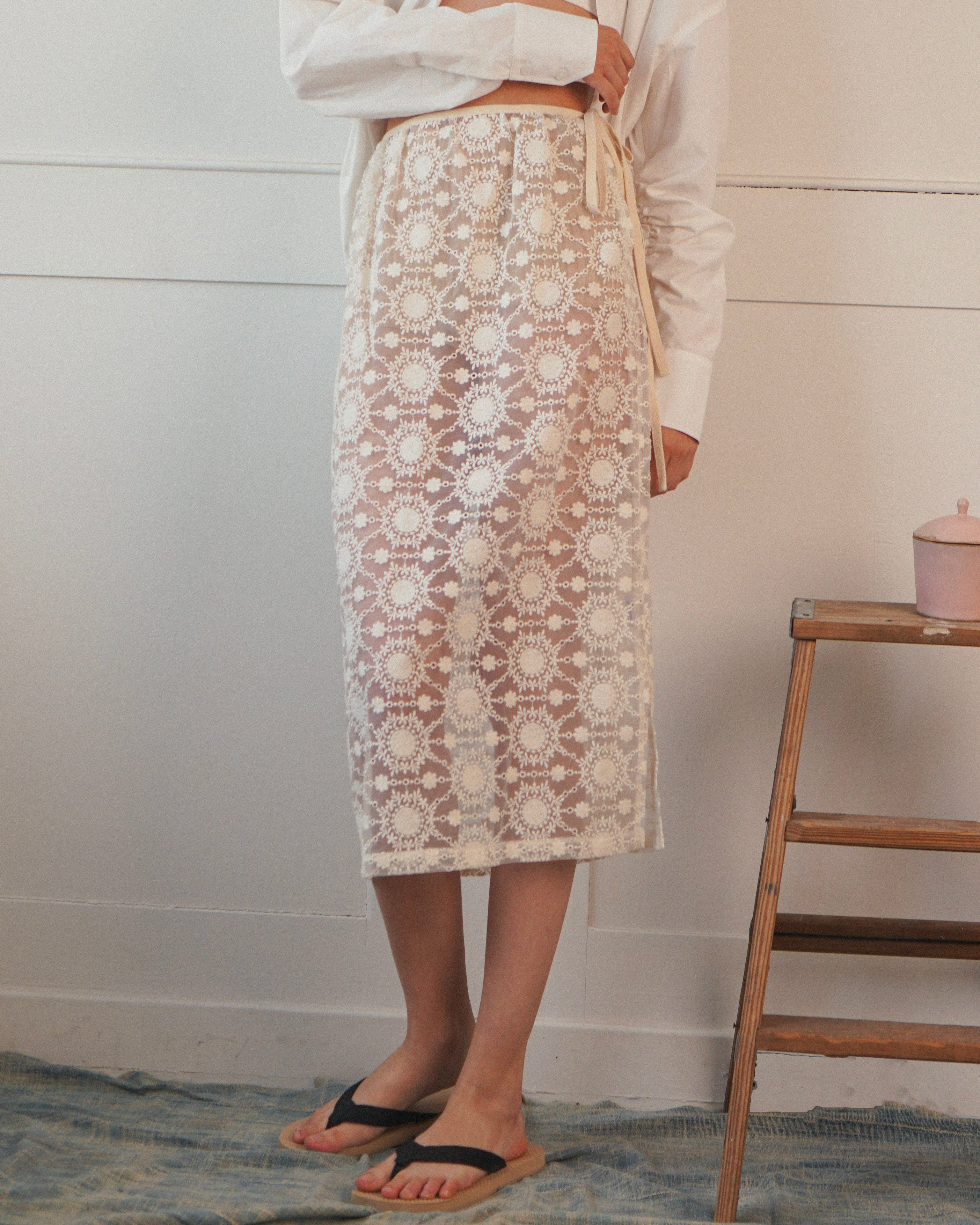 skirt showcases your silhouette through a veil of embroidered organza. Wear over tights, boy shorts, a slip... get creative!