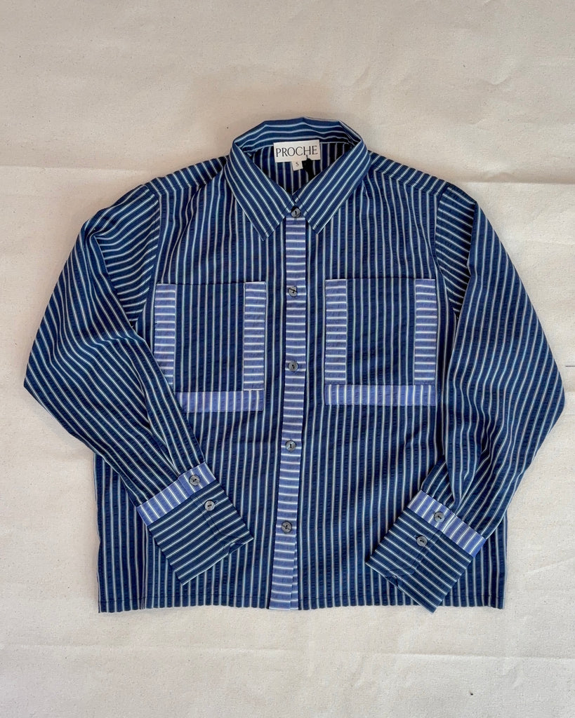 The Hotel button down features two large pockets, outlined in contrast stripes .